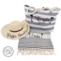 Welcome to Oh So Liza and thank you for visiting my shop. Have you been looking for the perfect gift with style to show off this summer, horizontal stripes continue to influence high street fashion, and this boardwalk beach bag delivers as a key statement piece for fans of the popular maxi-bag style. Then add in the Wide Brim Marbella Beach Hat and Turkish Beach Towel it shouts Chic all the way to the beach. The bag offers a chunky rope carry handle offering a classic nautical styling while premium brushed canvas makes this a robust choice for a day at the beach. With an inside zipper pocket to keep your small items safe on the sand. The hat has a wide stylish brim to protect you from the suns rays and the towel can be folded to a very compact package. The perfect go to Beach Set for any occasion. ???? ABOUT YOUR TOWEL, BAG AND HAT SET???? ************FLOPPY HAT************* Marbella wide-brimmed sun hat, Domed crown, Wide-brimmed design, Please see the Gallery for Sizing of the Hat **********TOTE BAG ************* Dimensions 36 x 35 x 18cm Handle length: 60cm. • Available in 5 classy colours: • pink striped • grey striped • navy striped • navy • natural **********TURKISH BEACH TOWEL************* These beautiful towels are handwoven in an authentic way according to traditional patterns. This makes this towel very special and so very beautiful. The towels are made of 100% cotton, weigh only 430 gram and can be folded to a very compact package. Therefore, they are ideal for transport in your suitcase, backpack or beach bag. Take them on trips to the beach, to your boat, to the swimming pool, to the sauna or to the gym. Hamamzz® are traditionally woven in Turkey. The tassels are twisted and knotted by women by hand. Size One size (100 x 180cm) OR (40inches x 71 inches) ???? HOW TO ORDER???? 1. Select the Colour Towel you Would Like (from the drop down menu) 2. Select the Colour Bag you would like (from the drop down menu) 3. Message Us With the Colour Text and Name You Would Like printed on both the Hat, Bag and Towel. Unless a colour is advised the Hat will always come with Black and the Bag and Towel will come with the colour matching the towel. *THIS LISTING IS FOR THE PERSONALISED BAG, TOWEL AND HAT ONLY, PROPS NOT INCLUDED* **If you would like a custom listing for a larger quantity of bags then please let me know and I will sort this out for you asap. Colours may appear different due to monitors/screens. Thank you for shopping with me. Oh Liza © All designs and images belong to OhSoLiza and are subject to Copyright - do not replicate in any way.