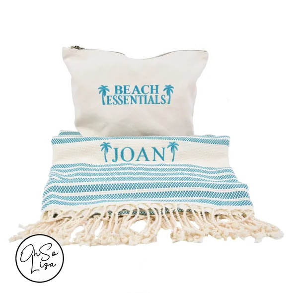 Welcome to Oh So Liza and thank you for visiting my shop. Have you been looking for the perfect gift with style to show off this summer, this boardwalk beach bag delivers as a key statement piece for fans of the popular maxi-bag style. Then add in the Turkish Beach Towel with a Beach Essentials Mini Bag it shouts Chic all the way to the beach. The bag offers a chunky rope carry handle offering a classic nautical styling while premium brushed canvas makes this a robust choice for a day at the beach. With an inside zipper pocket to keep your small items safe on the sand. The towel can be folded to a very compact package and the essentials bag keeps all those littler items in one place. The perfect go to Beach Set for any occasion. ???? ABOUT YOUR TOWEL AND ESSENTIALS BAG SET???? **********TURKISH BEACH TOWEL************* These beautiful towels are handwoven in an authentic way according to traditional patterns. This makes this towel very special and so very beautiful. The towels are made of 100% cotton, weigh only 430 gram and can be folded to a very compact package. Therefore, they are ideal for transport in your suitcase, backpack or beach bag. Take them on trips to the beach, to your boat, to the swimming pool, to the sauna or to the gym. Hamamzz® are traditionally woven in Turkey. The tassels are twisted and knotted by women by hand. Size One size (100 x 180cm) OR (40inches x 71 inches) ***ABOUT YOUR PLAIN ESSENTIAL BAG** Cotton Canvas Bag in PLAIN Black, Navy, Pink, Gray, Off White and Natural With A Durable Metal Vintage style metal. Dimensions L - 13 x 9 x 4.3 Inches, Perfect for your all your Creams ect ???? HOW TO ORDER???? 1. Select the Colour Towel you Would Like (from the drop down menu) 2. Select the Colour Essentials Bag you would like (from the drop down menu) Include in the Personalisation box the Thread Colour you would like adding to the Bag and Towel with Name/Text you would like embroidered on the Beach Towel NB (The thread colour will always be used to match the towel unless otherwise stated) Example We need 1 set Natural Essentials Bag Hot Pink Text ( Beach Essentials) to match towel Towel Pink Text Liza in Pink to match towel *THIS LISTING IS FOR THE PERSONALISED BAG, TOWEL ONLY, PROPS NOT INCLUDED* **If you would like a custom listing for a larger quantity of bags then please let me know and I will sort this out for you asap. Colours may appear different due to monitors/screens. Thank you for shopping with me. Oh Liza © All designs and images belong to OhSoLiza and are subject to Copyright - do not replicate in any way.